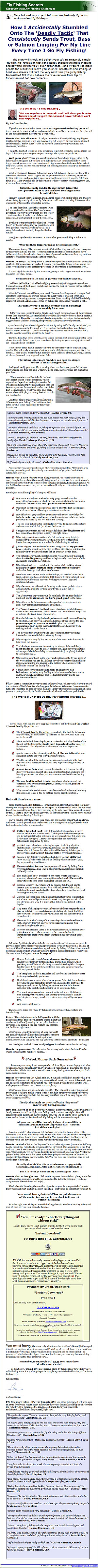 "The story will shock and delight you! It's an amazingly simple "fly fishing" revelation that consistently triggers the most shocking and powerful strikes you'll ever experience...and if you're like most people the results will leave you stunned, breathless and smiling so hard your cheeks will hurt the very next time you go fly fishing! Impossible? Not if you believe the rave reviews from top fly fishermen and hot new comers..."
