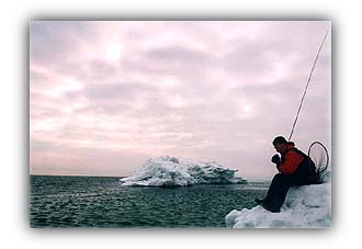 The fish don't eat much and move very slowly, but even with ice on the shore, the fish often go for flashy, happy-colored (red/orange/purple), deeply fished, slowly retrieved flies. This is the time of year to use a sink tip or sinking line. The fishing is best on mild and sunny days in shallow water over dark bottom.