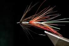 The basic pattern falls somewhere in the group of Ullsok, Omoe Brush, Irish Shrimp-tradition flies.It even uses some colors that I love: silver, black and red and materials that I love, in particular the red Golden Pheasant feathers. The large black front hackles on my Djihads come from my own roosters, which I used to have in my garden when I lived in a house.