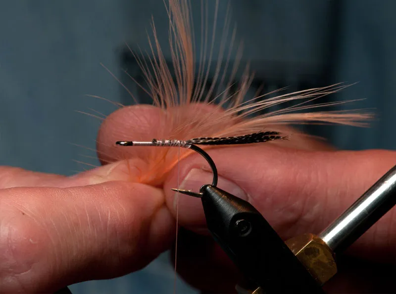 Pick a couple of medium long Whiting Spey Hackle feathers and arrange them with the curved side towards each other