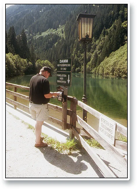 Andy collecting day tickets and catch reports on the dam of the gin clear, stocked Stausee.