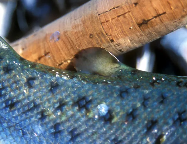 The hallmark of salmonids: the small adipose fin right in front of the tail.