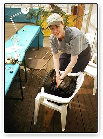 American fly tier Kim Gulinger - also known as Damselfly - tries to stuff all that tying material into a bag after the show.