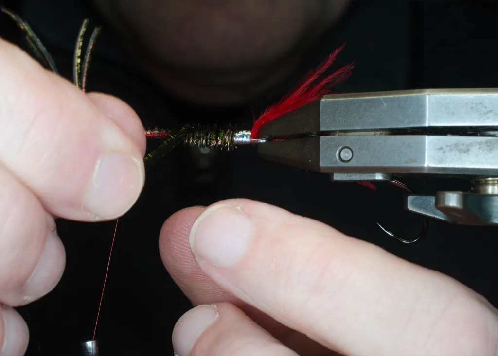 Take the thread forward and wrap the herl in touching turns to right behind the front eye. Leave space for the hackle and a small head.
