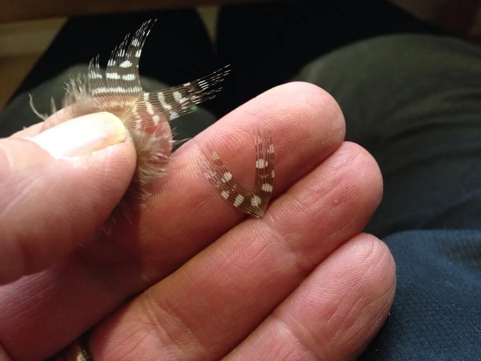 Selct a pair of small guenia bird feathers and cut a v-shape in both of them