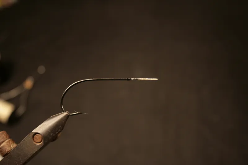 Whip finish the thread and cut it off, put a bit of lacquer on it to lock down the materials and make a smooth transition from hook shank to head area.