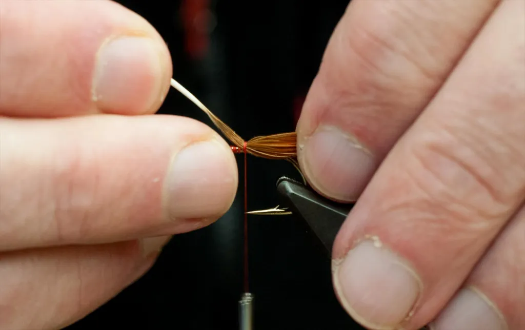 Pull the feather forwards to gather the fibers and adjust the tail length