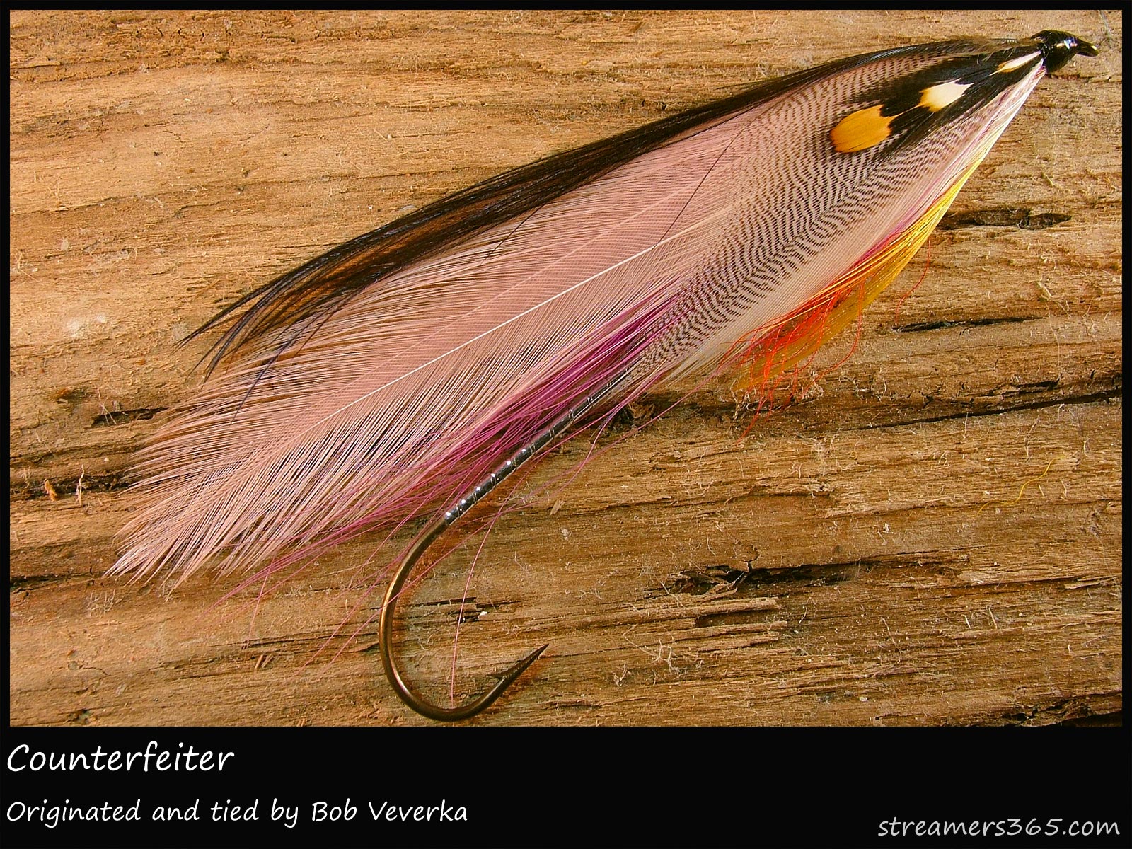 Wing: Mixed pink and lavender bucktail over which are dun hackles.